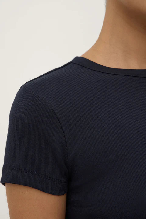 Designed for a slim fit, this tee is crafted from a stretchy cotton fabrication and features a ribbed design with cap sleeves and a centre-back seam detail.